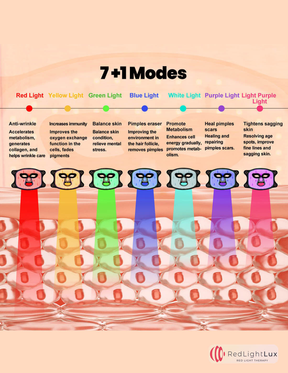 - Le masque émet des longueurs d'onde optimales de lumière rouge (630nm) verte (520nm) et bleue (470nm), pour un total de 7 couleurs différentes.